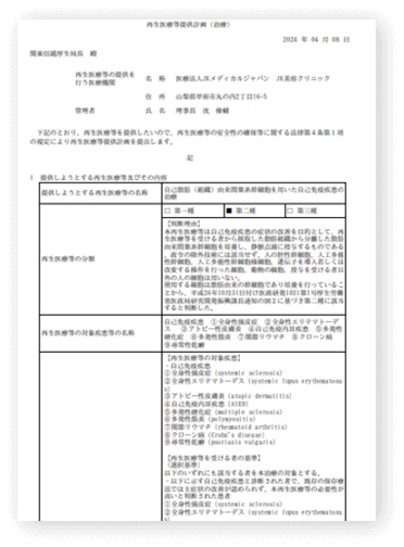 幹細胞を用いる再生医療は、厚生労働省が認めた特定認定再生医療等委員会で、 その治療の妥当性・安全性・医師体制・細胞加工管理体制が厳しく審査されます。
