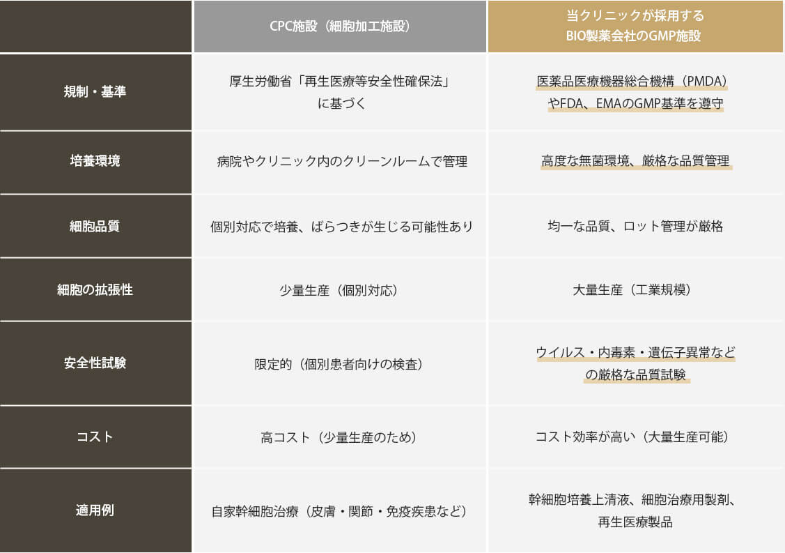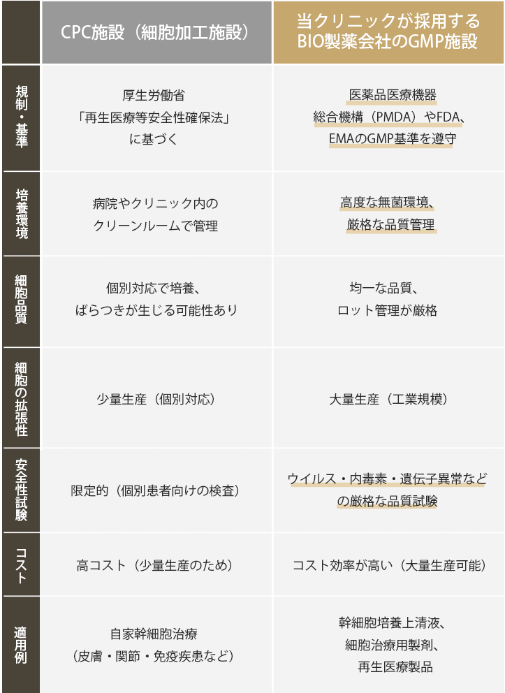 幹細胞を培養する施設にはCPC(Cell Processing Center)とBIO製薬会社のGMP(Good Manufacturing Practice)施設の2種類があり、それぞれの特性によって幹細胞の品質や用途に違いが生じます。