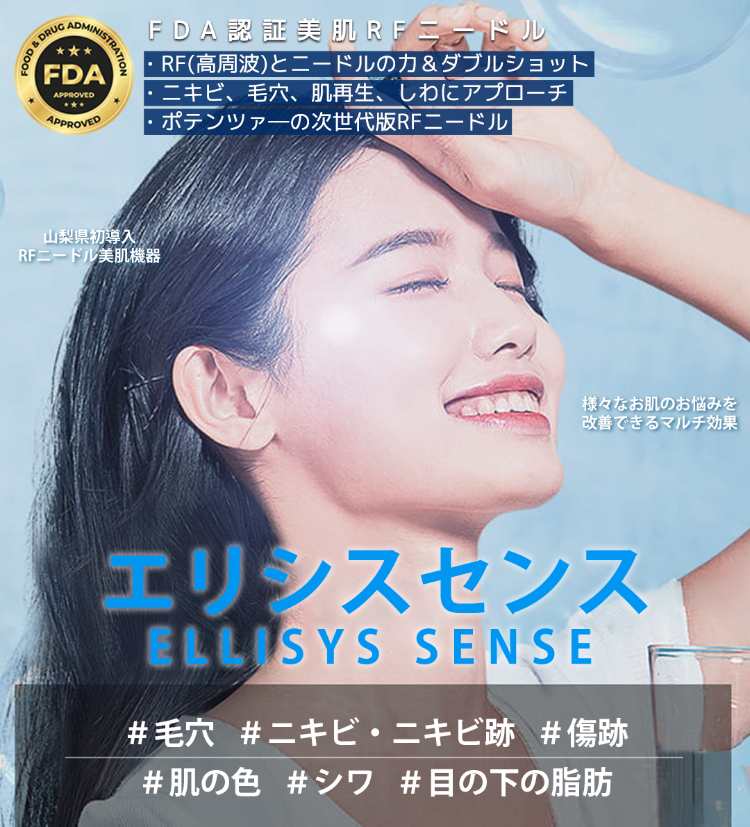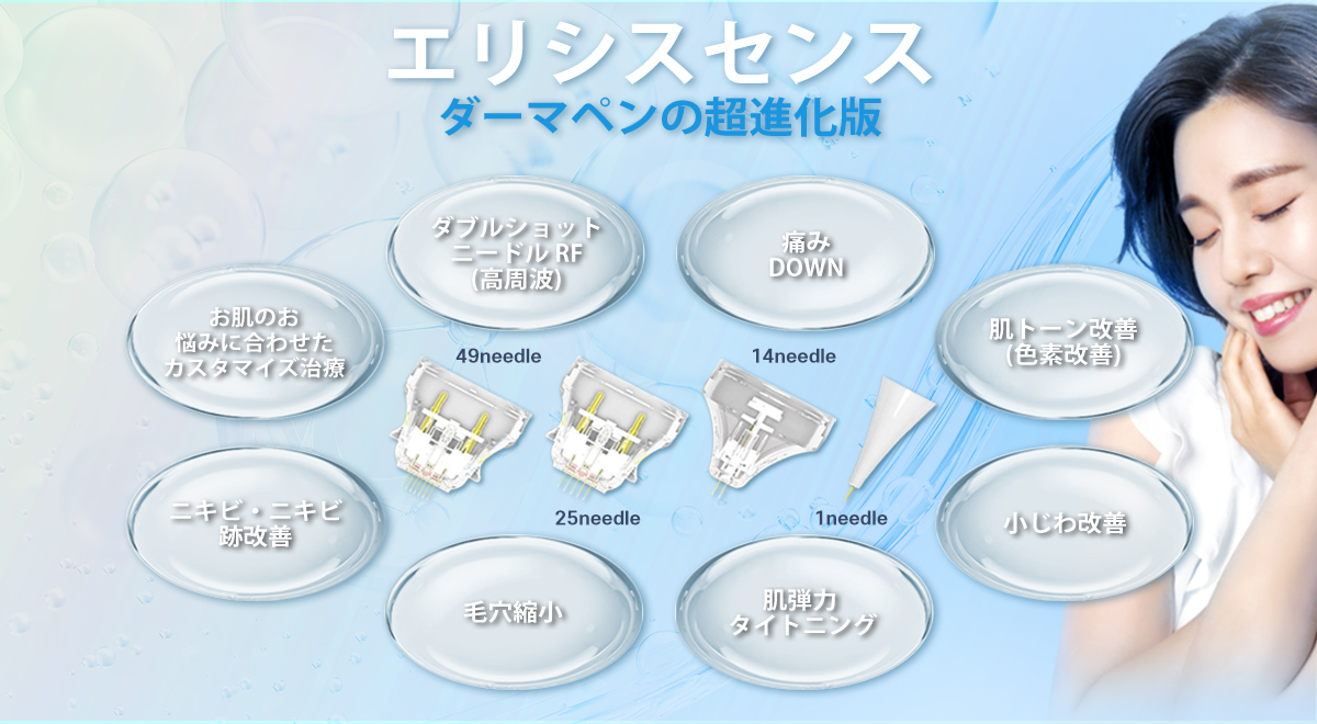 ダーマペンの超進化版で、皮膚の真皮層に微細な針(マイクロニードル)を挿入して表皮に熱損傷を起こすことなく、針先から真皮層に直接、瞬間的な高周波を照射する施術です。ニキビ、ニキビ跡、小じわ、毛穴の開き、肌トーンなど様々なお肌の悩みを改善する治療機器です。