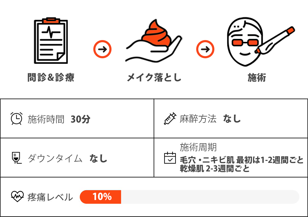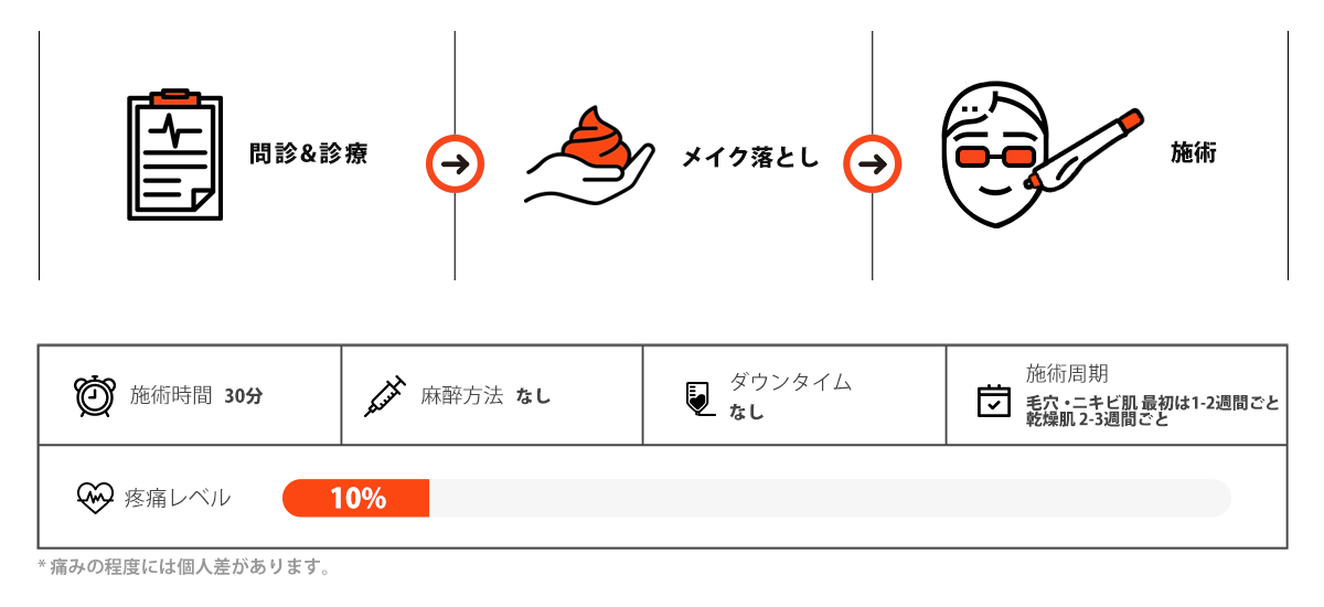 通常10分ほどかかります。 お客様の肌の状態や部位によって施術時間は短くなることがあります。