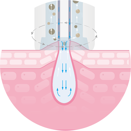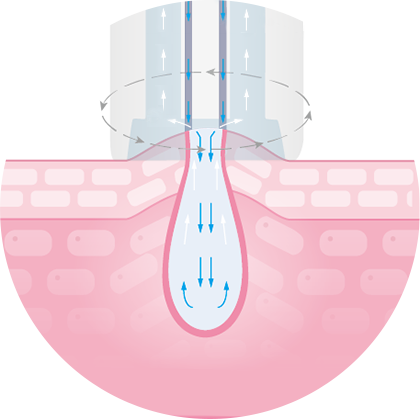ハンドピースチップ内の陰圧システムにより毛穴をディープクレンジングさせ、微細刺激を与えます。