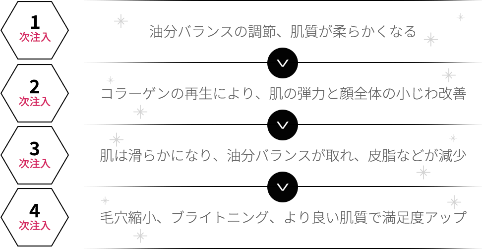 PNはPDRNよりLong-chainのDNA分画で分子量がPDRNより大きく、水分子とも簡単に結合する特徴を持っているため、Hydration(水化)効果が優れています。また高分子PNはヒアルロン酸と同じ支持体の役割をし、高分子であるため皮膚の中で長く残る、またその効果がより長く持続するという点がリジュラン(PN)とサーモン注射・DNA注射(PDRN)の大きな違いだといえます。