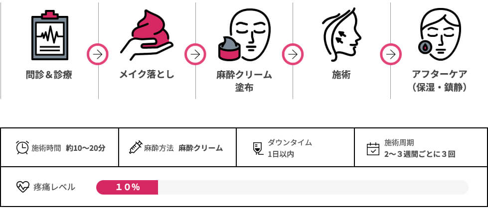 施術後は肌が乾燥しますので、保湿を心がけて下さい。また、日常生活の中で日焼け止めクリームを塗るように心がけてください。