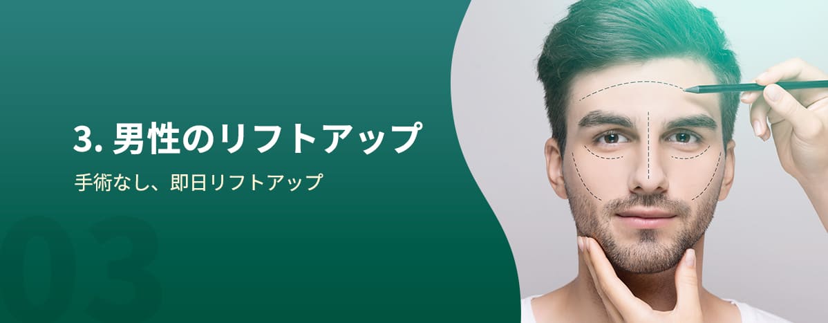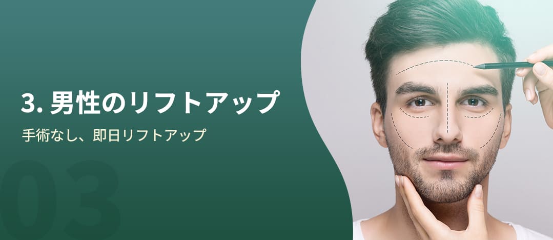 男性のリフティングは骨格の構造に合わせてお顔全体のバランスを考え、 肌の厚さ、弛みの程度、シワの深さの程度を考慮して診断を行います。 男性の老化を理解したリフティングレーザーの選択、レーザーの強度、ショット数、施術部位を決定します。