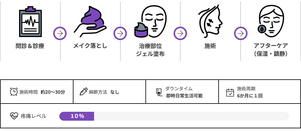 施術部位とショット数によって異なりますが、オリジオならではの速い施術で通常約20分程度所要します。