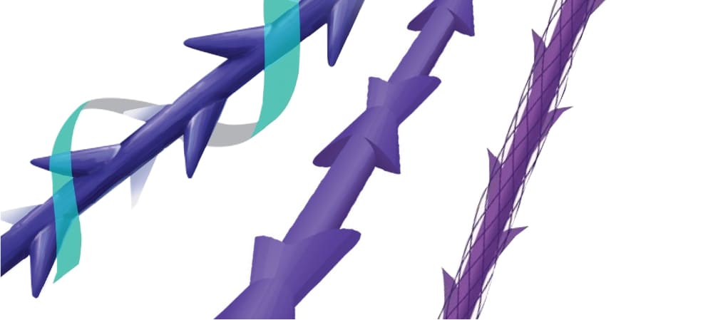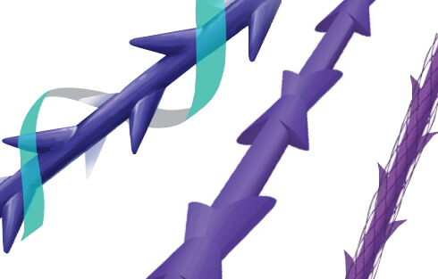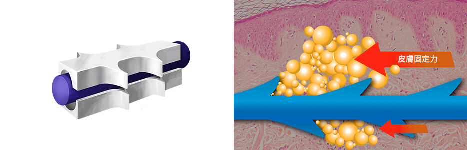 スクリュー型で3次元の突起を持つ糸を利用し、