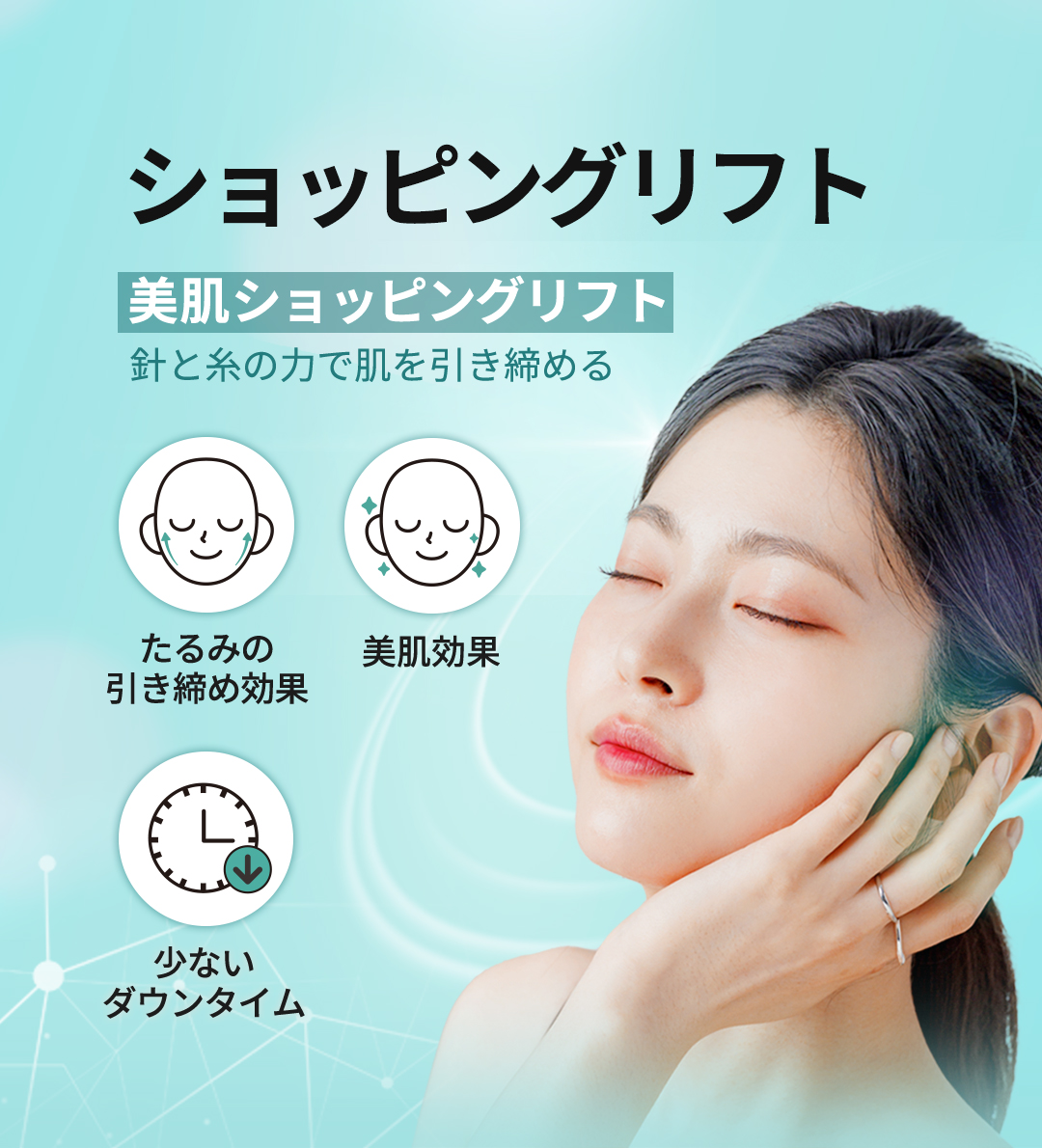· 自然な効果:ショッピングリフトは、顔や目元、首などの肌に弾力やハリを取り戻し、自然な若々しさを引き出すための美容療法です。この施術では、極細の溶ける糸を使用し、皮膚の下に挿入してコラーゲンの生成を促します。ショッピングリフトは、その手軽さから「ショッピング中にできるリフトアップ」として名前が付けられ、多忙な方や初めてリフトアップを試みる方に最適です。