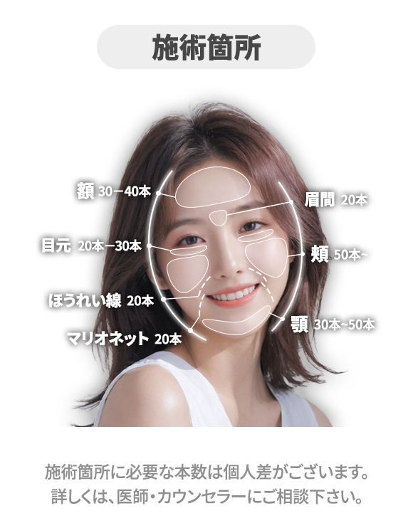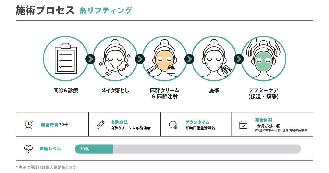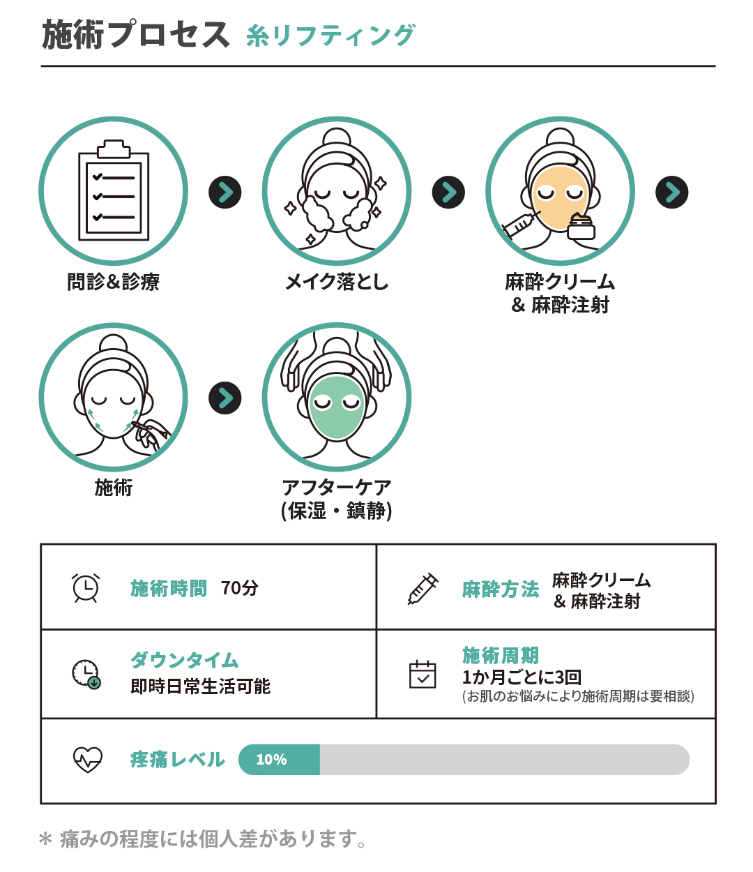 · ダウンタイムがほとんどなし:施術後は軽い腫れや内出血がある場合がありますが、メイクでカバーできる程度で、通常は当日中に日常生活に戻れます。忙しい方にも適した手軽なリフトアップ方法です。